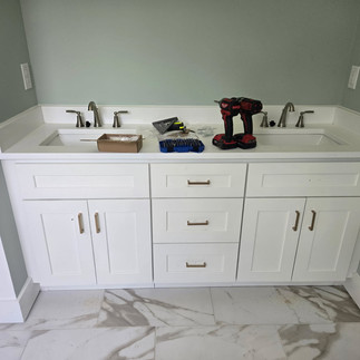 The custom range hood vent was installed into the kitchen. The herringbone pattern subway tile backsplash was artfully installed with an elegant pot filler above the stove. Cabinet hardware in brushed brass finish is in the process of being installed.